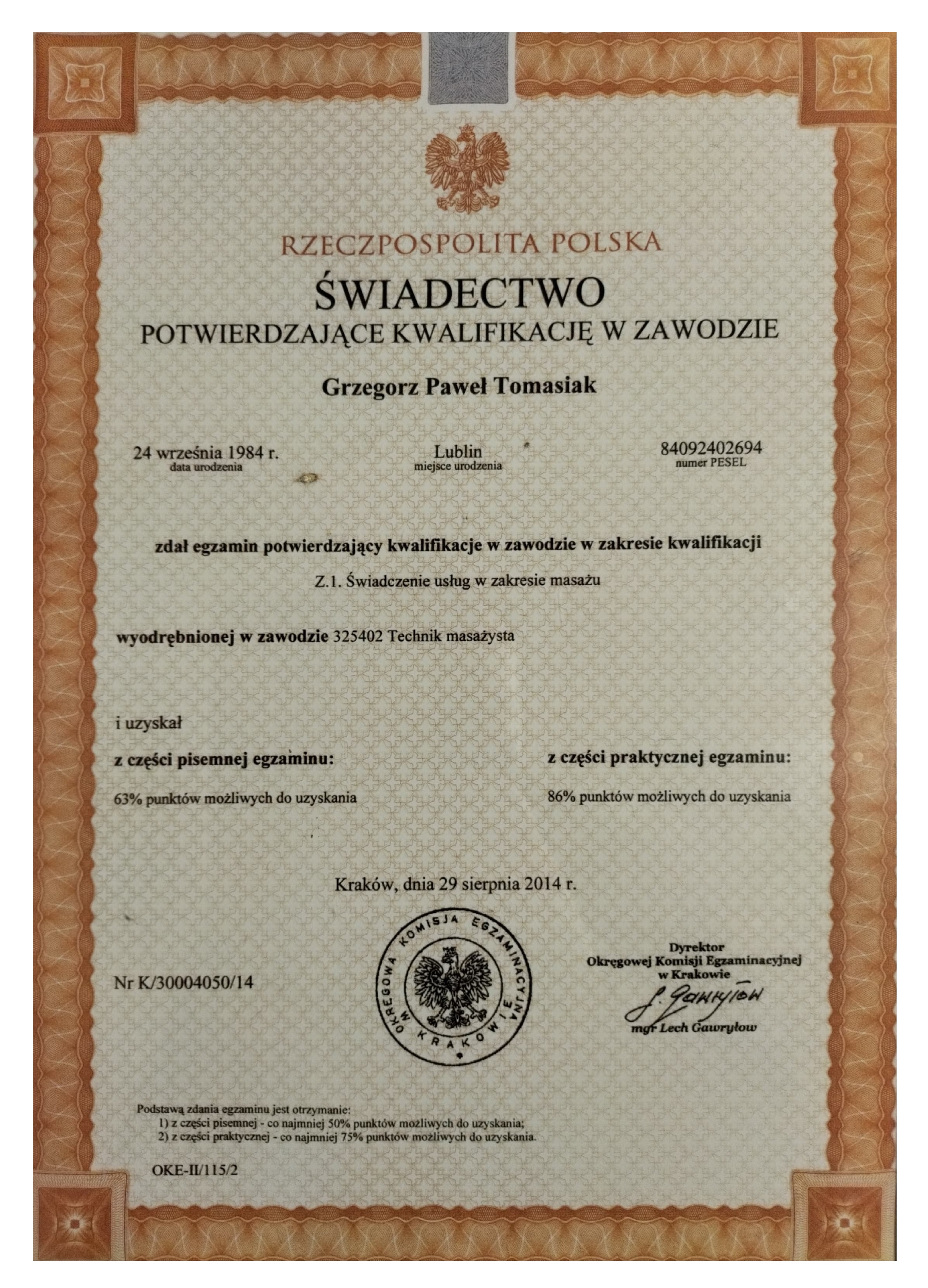 Posiadam 10-letnie doświadczenie oraz liczne ukończone kursy i certyfikaty, które potwierdzają moją wiedzę i umiejętności w dziedzinie masażu i fizjoterapii. Dzięki ciągłemu doskonaleniu umiejętności jestem w stanie zapewnić pacjentom kompleksową i skuteczną opiekę.